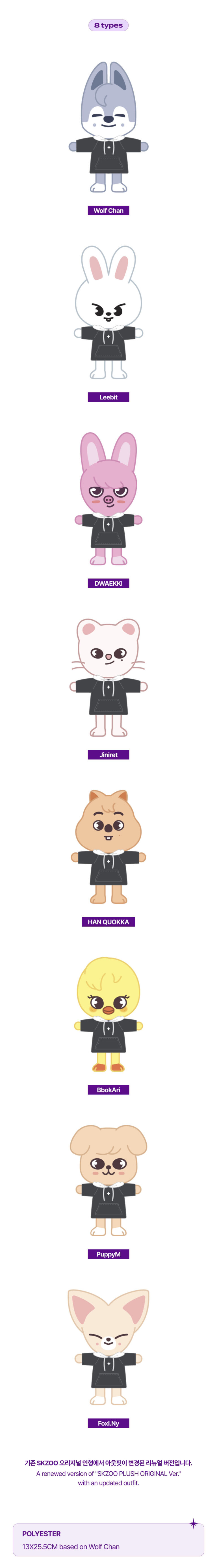 Crafted with premium-quality materials, soft textures, and detailed embroidery, these SKZOO plush dolls are both collectible and huggable. Fans can choose their favorite member’s SKZOO character — Wolfchan, Leebit, Dwaekki, Jiniret, Bbokari, PuppyM, FoxI.Ny, or Hanquokka — and bring the magic of Stray Kids to life.